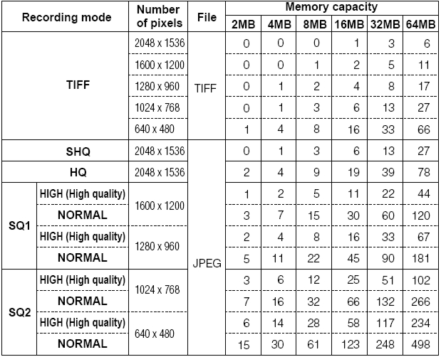 Tabela za približno oceno koliko posnetkov lahko naredimo
