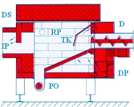 emisije dimnih plinov. Ostanki pepela drsijo v zbiralnik